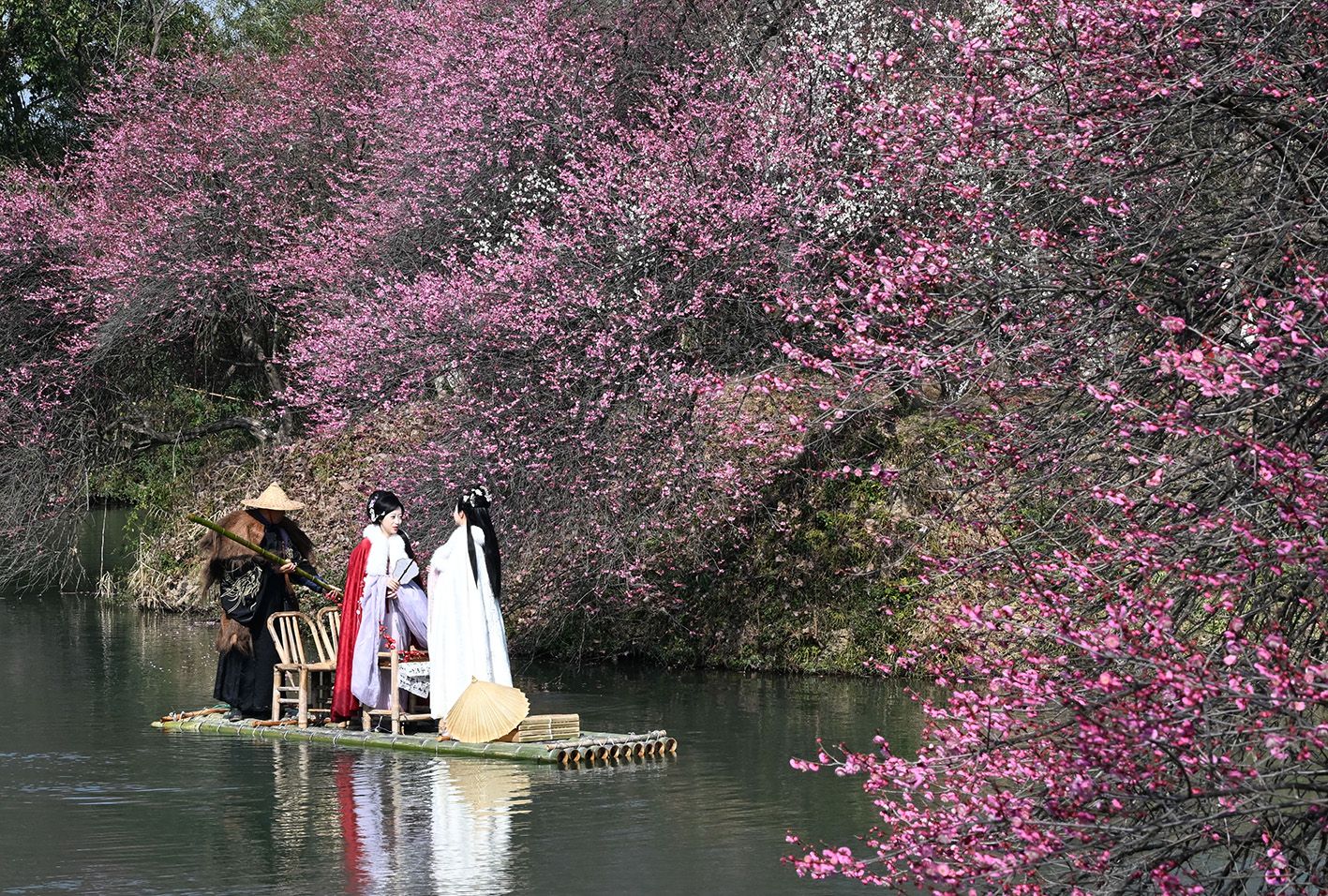 2月18日,古装爱好者泛舟杭州西溪赏梅花。近日,杭州西溪湿地约300亩的梅林次第开花,民众在“曲水寻梅”中感受早春美好时光。(中新社)