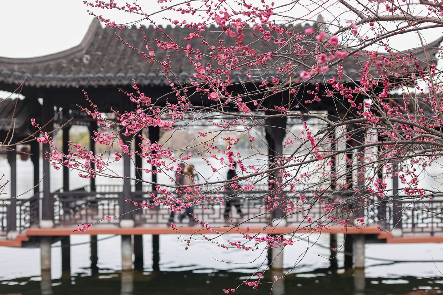 2月18日,游人在西溪水边赏梅。春意渐浓,杭州西溪国家湿地公园里的梅花竞相绽放,美轮美奂。西溪湿地已迎来最佳赏梅时期。(中新社)