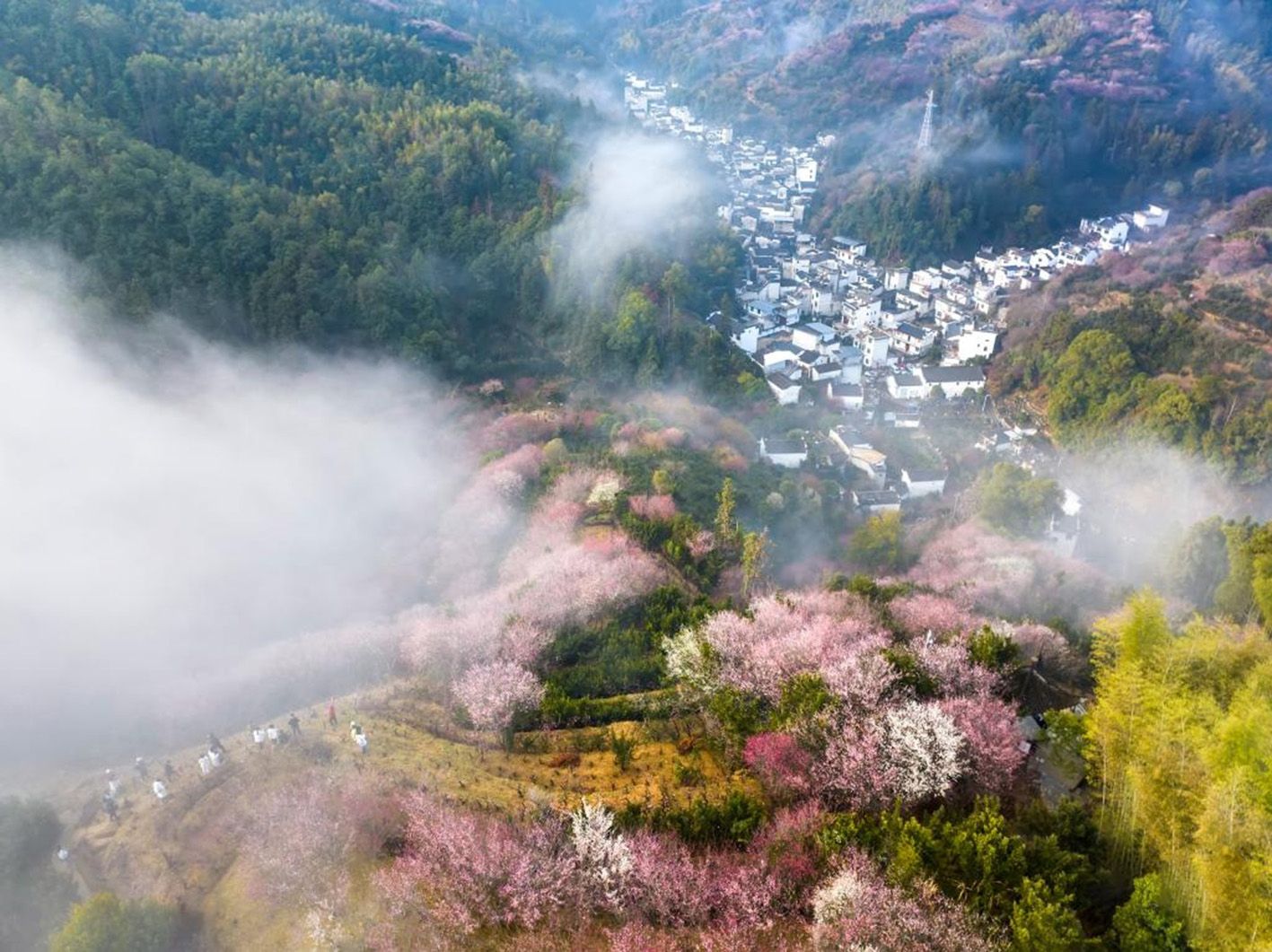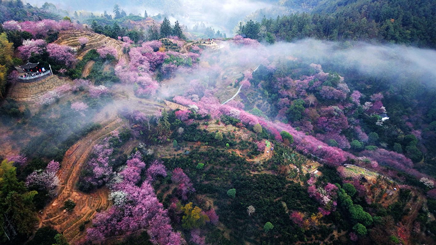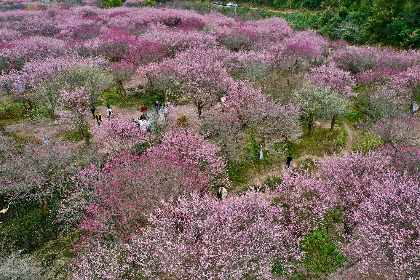 2月18日,安徽省黄山市歙县雄村镇卖花渔村,漫山遍野的梅花竞相绽放。(人民网)