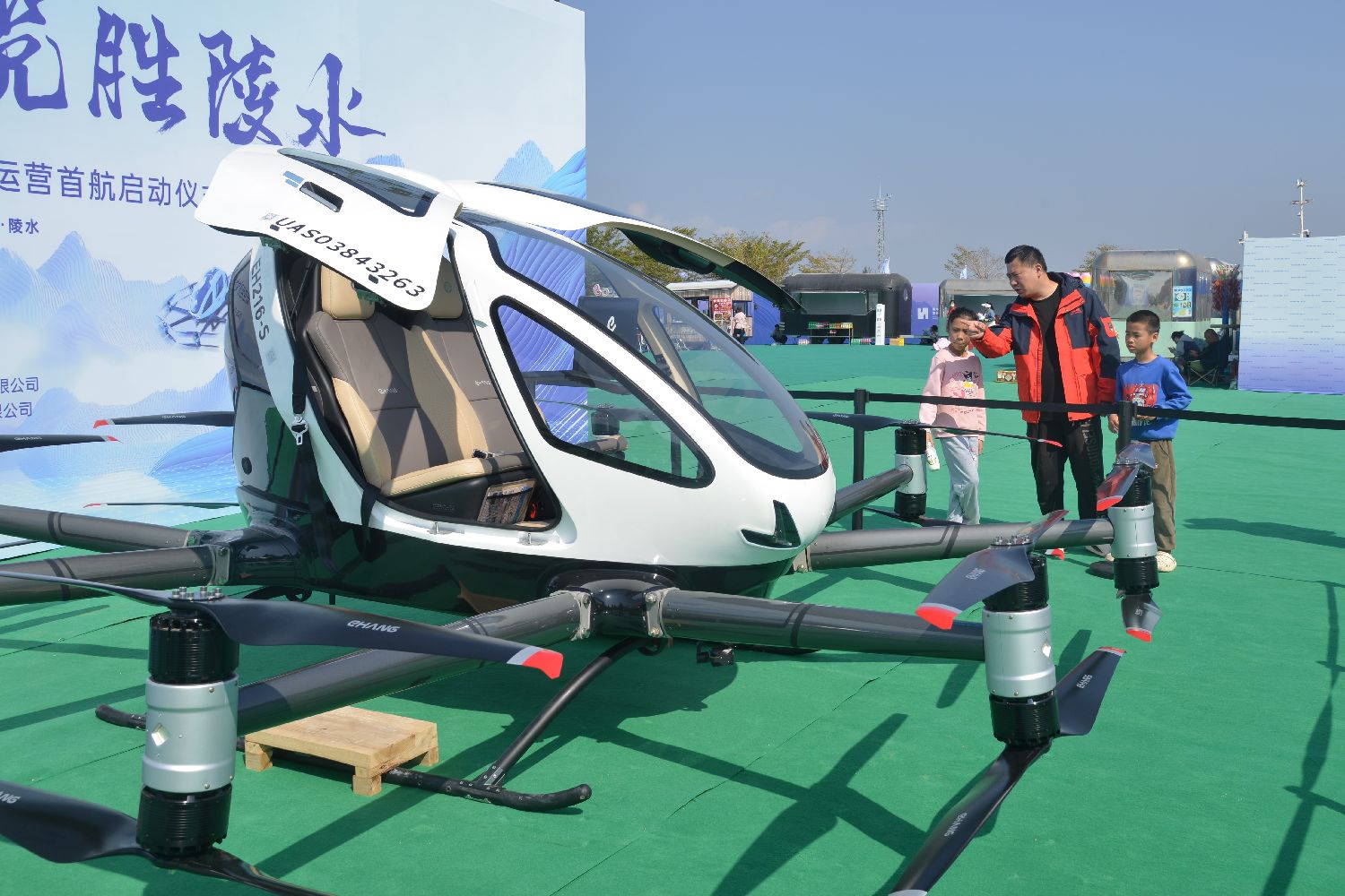 图为游客近距离参观EH216-S无人驾驶载人航空器。(图/中新社)