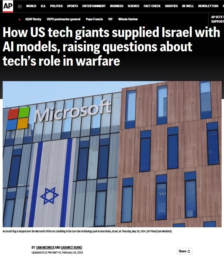 美国科技巨头悄悄授权以色列利用其人工智能和云计算服务,以更快地追踪和杀死加沙地带和黎巴嫩的所谓“武装分子”。(图/美联社报道截图)