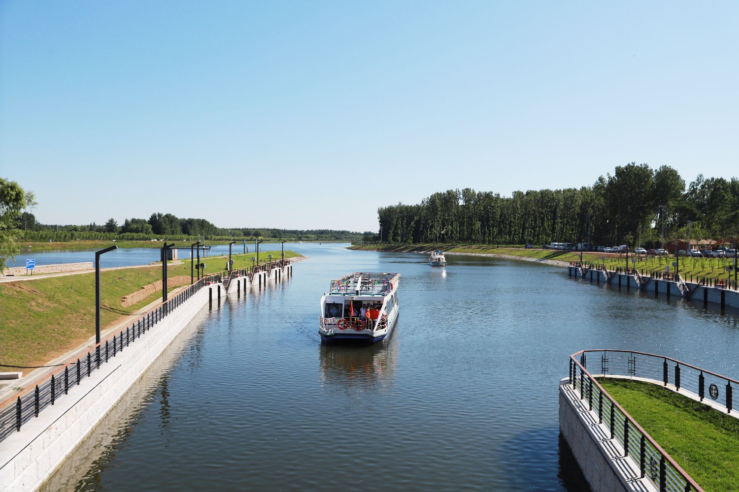北京时间2024年6月24日上午,京杭大运河北京段、河北段联合举行京冀游船通航仪式,承载市民、建设者、媒体代表的通州、香河船只相向缓缓驶过船闸,标志着大运河京冀段全线62公里实现通航,京冀协同发展又向前迈进重要一步。(图/中新社)