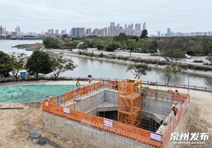2月21日,建设者们在位于晋江南岸的金门供水水源保障南高干渠供水替代工程N2标工作井紧张忙碌着。(图/泉州发布)