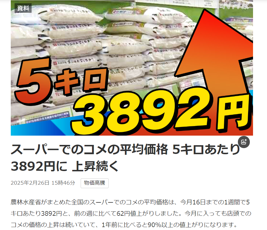 截至2月16日的一周内,日本全国超市大米的平均价格较前一周上涨了62日元,达到每5公斤3892日元。(图/NHK报道截图)