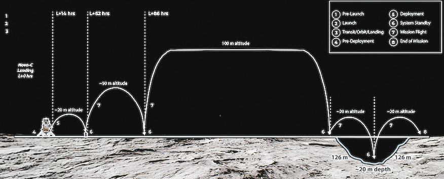 特伦特·马丁介绍说,预计“雅典娜”探测器在月球表面上着陆约14小时后,“格蕾丝”将进行第一次“跳跃”,目标是达到约20米的高度并居高临下收集地面探测数据;着陆约62小时会进行第二次“跳跃”,但这次的目标是约50米的高度;着陆后的86小时将尝试最高的“跳跃”,跳到100米的高度;此后“格蕾丝”将根据之前的勘测数据,跳入约20米深的火山口或陨石坑。科学家认为,月球陨石坑或火山口被遮蔽的部分终日不见阳光,很可能隐藏有水冰资源,但此前从来没有机会能够实际勘测,“格蕾丝”此次将提供更直接的证据。