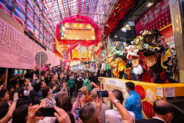 3月1日,“2025乙巳年雀仔园贺土地诞”醒狮贺诞仪式在庙前上演,吸引大批街坊、居民和游客参与。(图/香港中通社)