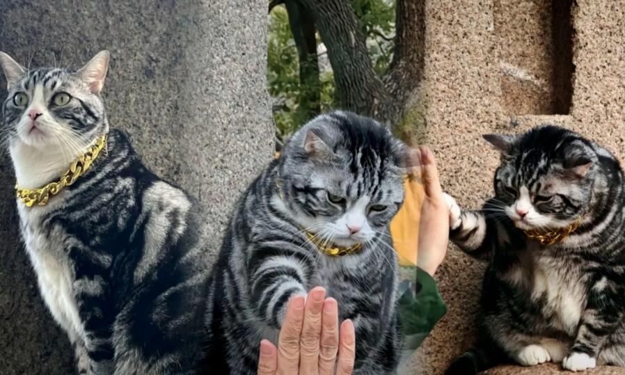 这只猫戴着金链子,游客伸手,它就会举爪子回应。有爱的互动萌到了很多游客和网民。