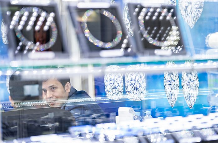 “盛汇超级三月”预计为香港带来约12万名高增值旅客。图为3月2日,一名钻石商家在第11届香港国际钻石、宝石及珍珠展上与买家洽谈。(图/中新社)