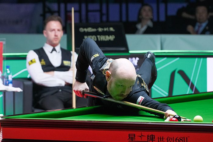 3月4日,2025年斯诺克世界大奖赛在启德体艺馆揭幕。图为贾德·特鲁姆普与加里·威尔逊(前)在比赛中。(图/中新社)