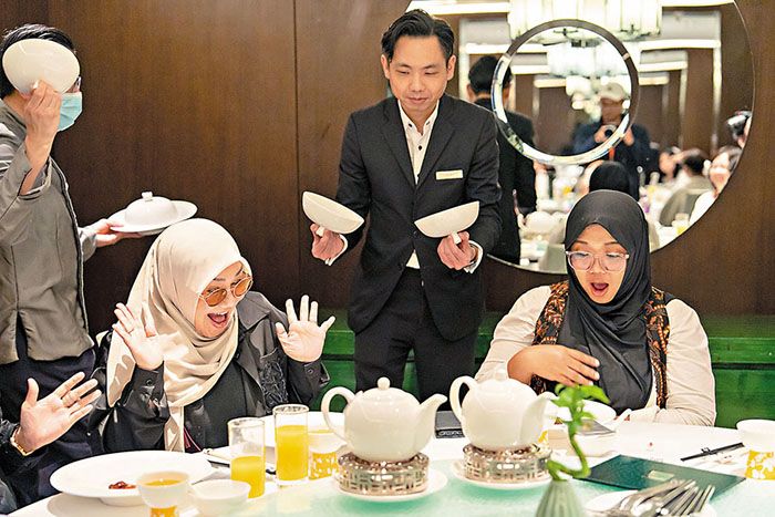 图为东南亚穆斯林旅游界考察团在香港品尝获清真认证的中菜。(图/香港旅发局)