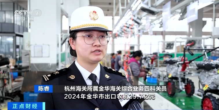 杭州海关所属金华海关综合业务四科关员 陈睿:据金华海关统计,2024年金华市出口农机29.7亿元,同比增长53.8%,主要出口至欧美和东南亚地区。我们提供了“7×24小时”预约通关模式,帮助企业能够随报随检,提高查验效率。