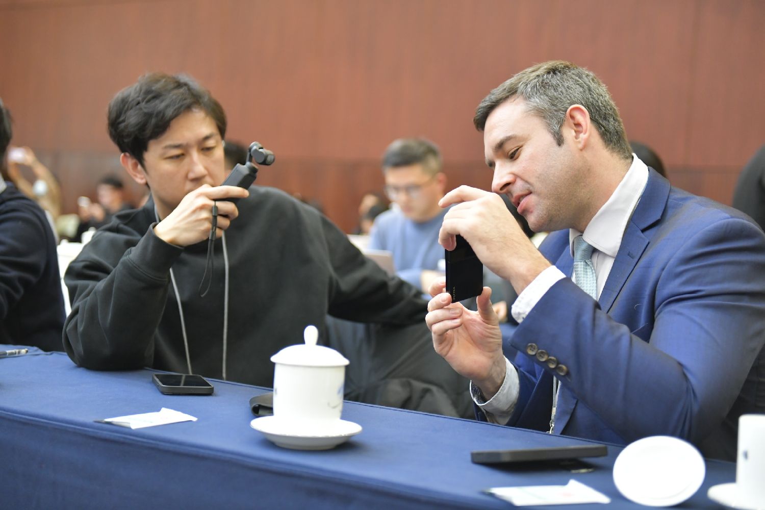 3月6日,十四届全国人大三次会议安徽代表团举行开放团组会议。图为外国记者(右)在现场使用中国语音翻译机接受采访。(图/中新社)