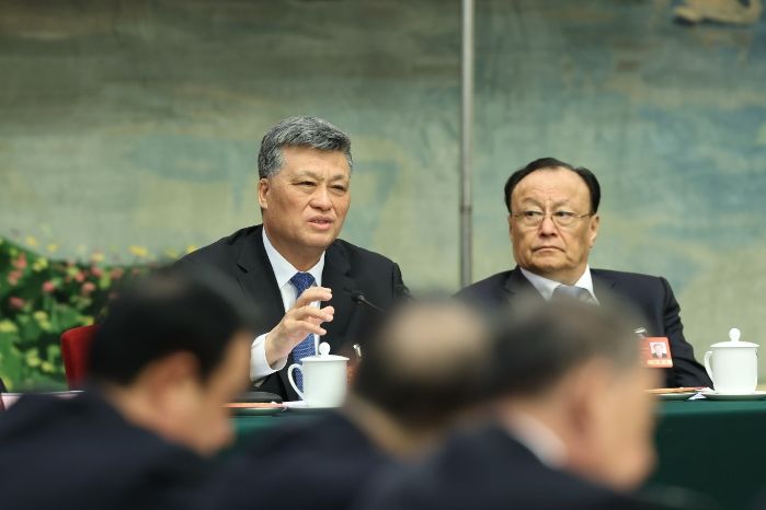 3月7日,十四届全国人大三次会议新疆代表团举行开放团组会议。图为新疆维吾尔自治区党委书记马兴瑞(左)回答记者提问。(图/中新社)