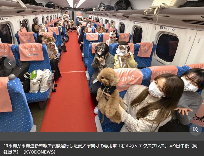9日,JR东海在往返于东京和新大阪之间的东海道新干线Nozomi号列车上试运行了可将宠物狗放出笼子的专用车厢。这样做的目的是缓解宠物焦虑,让主人可以和爱犬享受旅行的乐趣。
