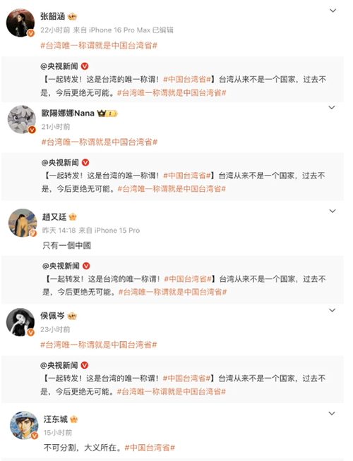 大批台湾艺人纷纷转发“台湾必归”海报,并留言“只有一个中国”。(图/新浪微博截图)