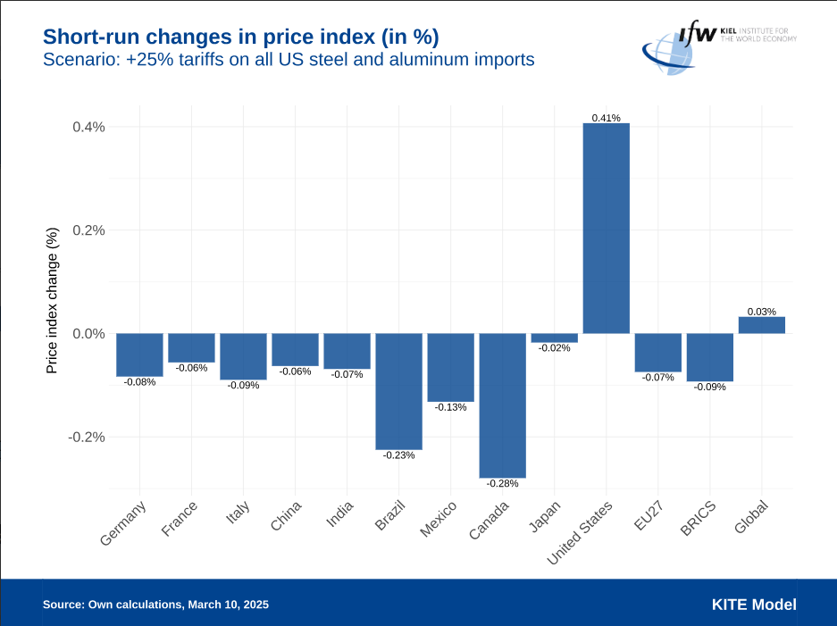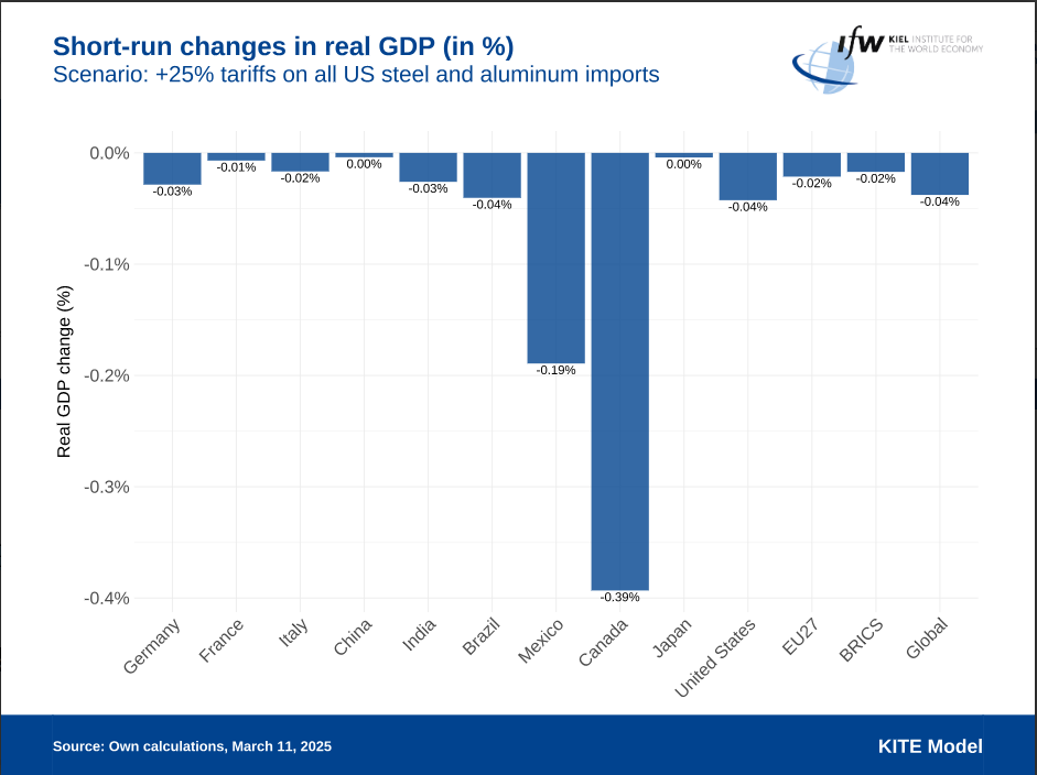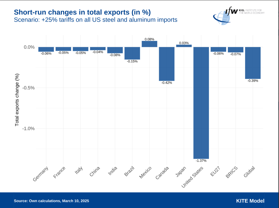 特朗普政府将于3月12日对所有进口至美国的钢铝征收25%的关税,这是特朗普此次任期内首次对欧盟产生直接影响的新保护主义措施。当地时间3月11日,德国基尔世界经济研究所发布贸易政策评估,称这一关税措施损害的主要是美国自身利益,而对欧盟几乎没有负面经济影响。不过,加拿大和墨西哥将遭受重大影响。