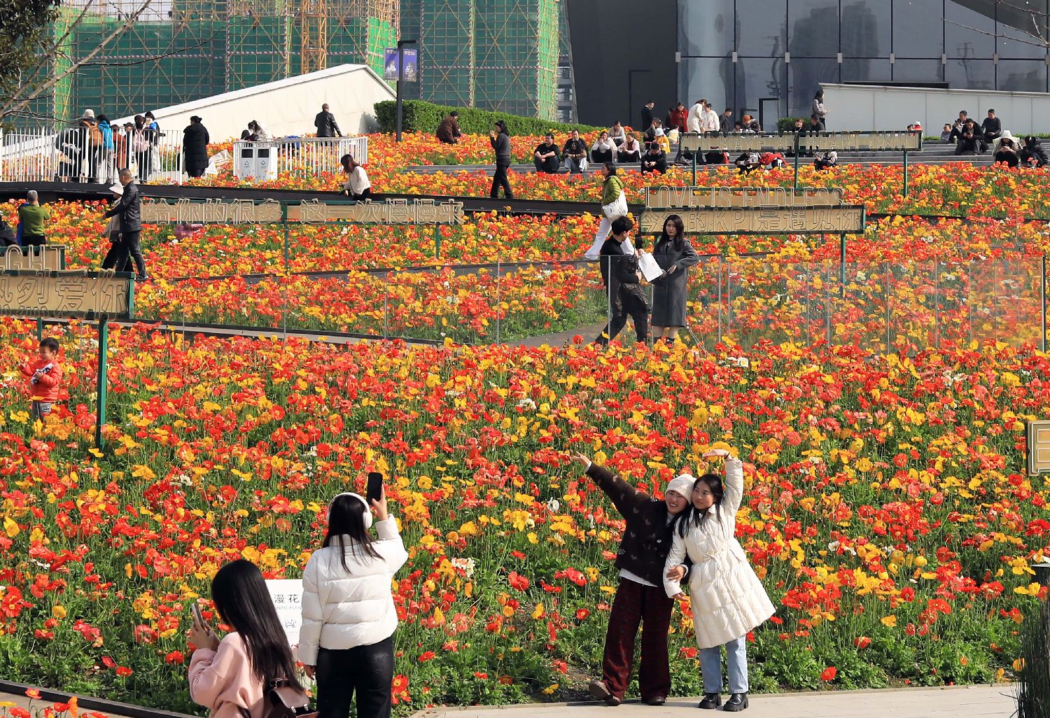 3月11日,四川省成都市温江区一公园内的虞美人花盛开,吸引市民漫步其中乐享春日阳光。(图/中新社)