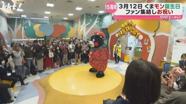 3月12日是熊本熊的生日。当天,在众多粉丝的陪伴下,熊本熊庆祝了自己的出道15周年纪念日,有约80人通过事先抽签参加了熊本市内举办的庆祝活动。