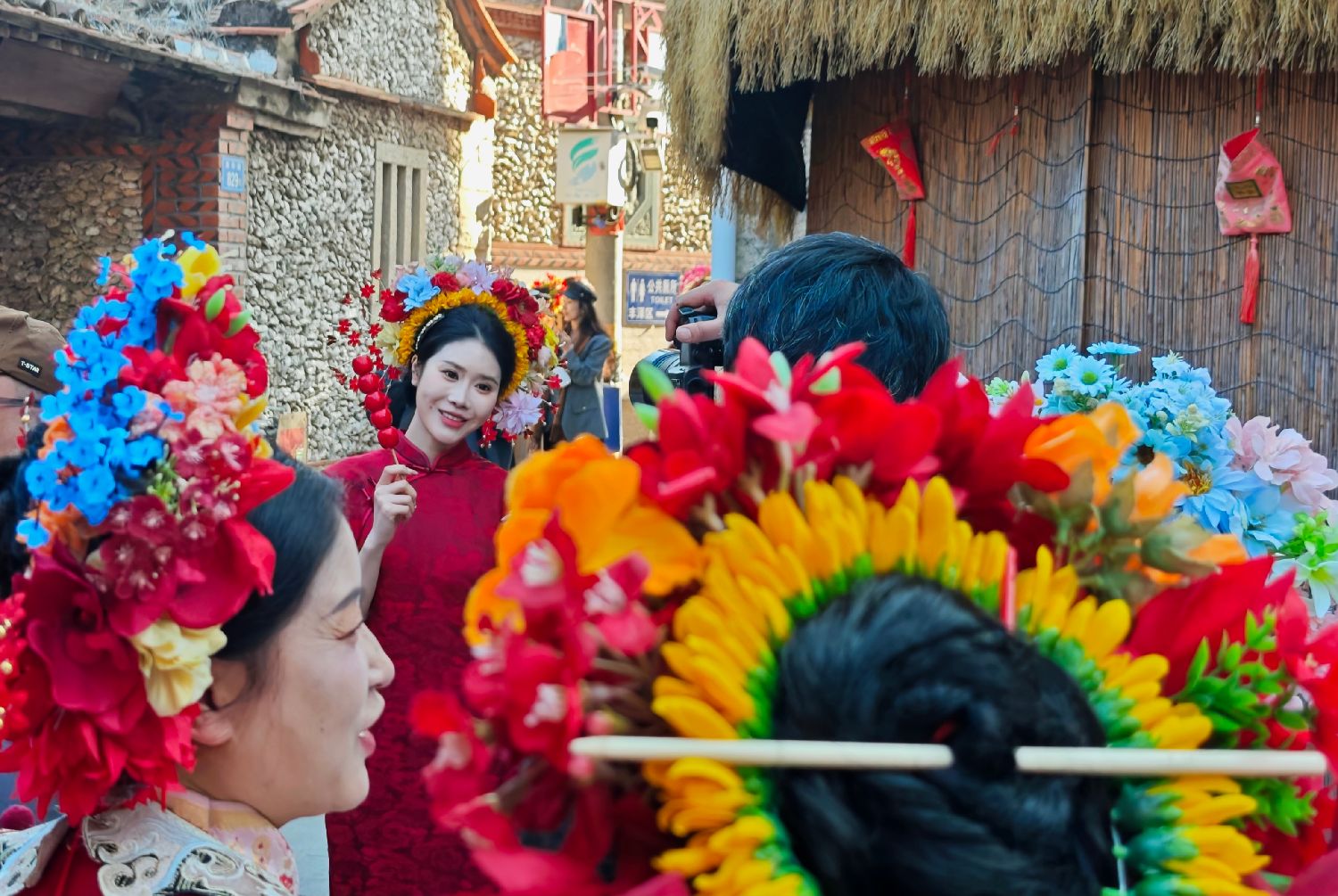 1月30日,福建泉州,游客头戴“簪花围”在蟳埔村游览、拍照。春节假期,福建泉州蟳埔村旅游持续火爆,各地游客纷至沓来,感受“簪花围”魅力。(图/中新社)