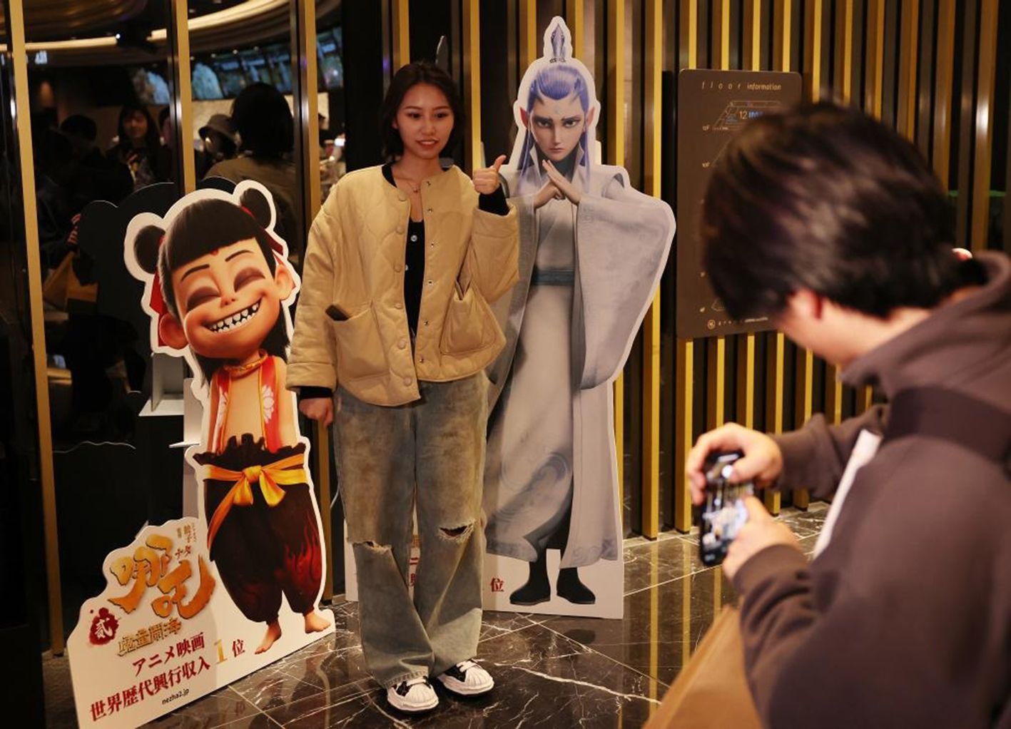 3月14日,在东京,一名观众在《哪吒之魔童闹海》日本首映式后与电影宣传板合影。(新华社)