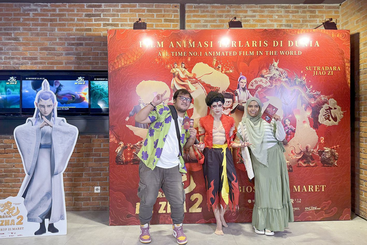 当地时间3月15日,中国动画电影《哪吒之魔童闹海》在印度尼西亚雅加达举行首映式,该影片将于3月21日在印尼院线正式上映。图为电影海报前,当地民众的“哪吒”造型炫酷吸睛。(中新社)