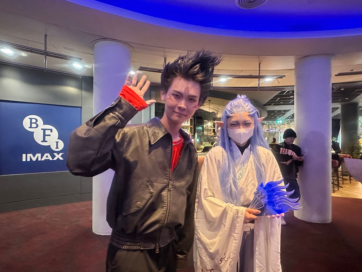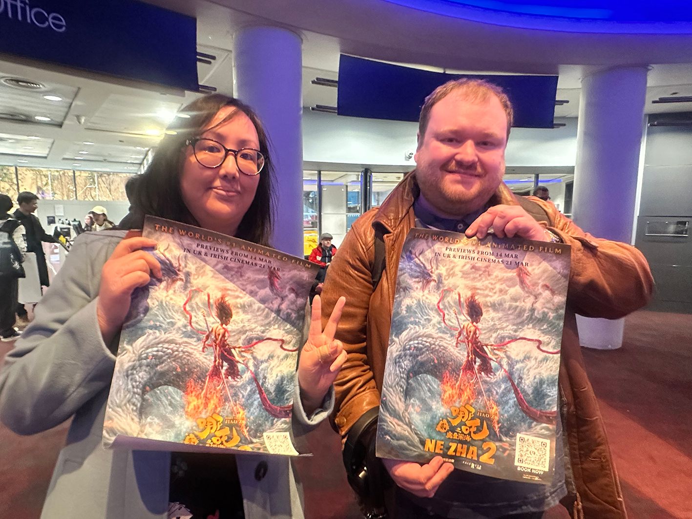 当地时间3月14日,中国动画电影《哪吒之魔童闹海》在英国伦敦点映,开启“欧洲之旅”。在英国工作的中国侨胞装扮成哪吒和敖丙的模样观影。(中新社)