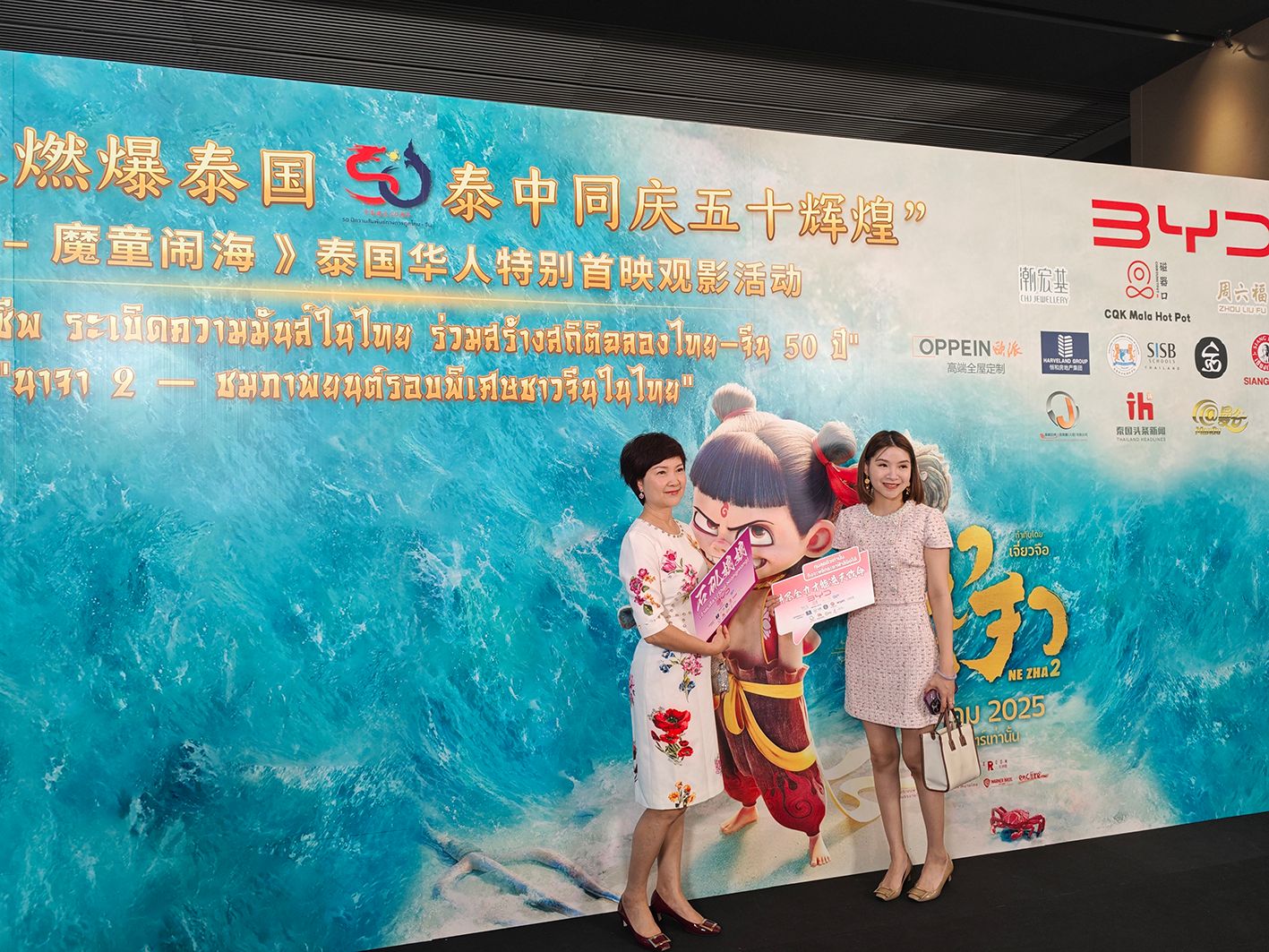 当地时间3月13日晚上,曼谷盛泰澜电影院举行《哪吒之魔童闹海》泰国华人特别观影会。图为参加观影会的泰国华人在电影院打卡。(中新社)