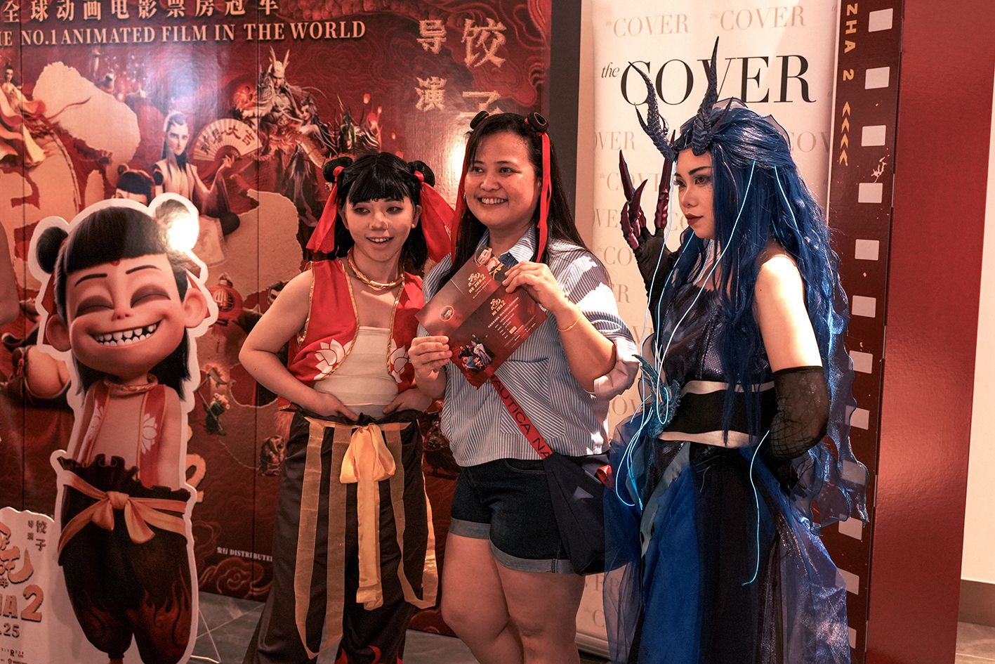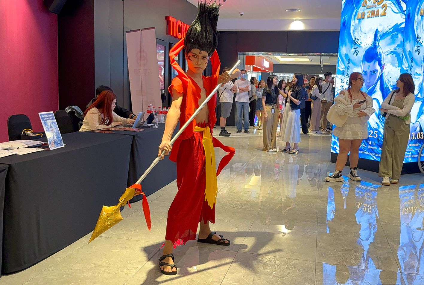 近日,《哪吒2》在马来西亚吉隆坡举行首映式,吸引千余观众观影。图为当地民众扮成剧中人物,吸引观众合影。(中新社)