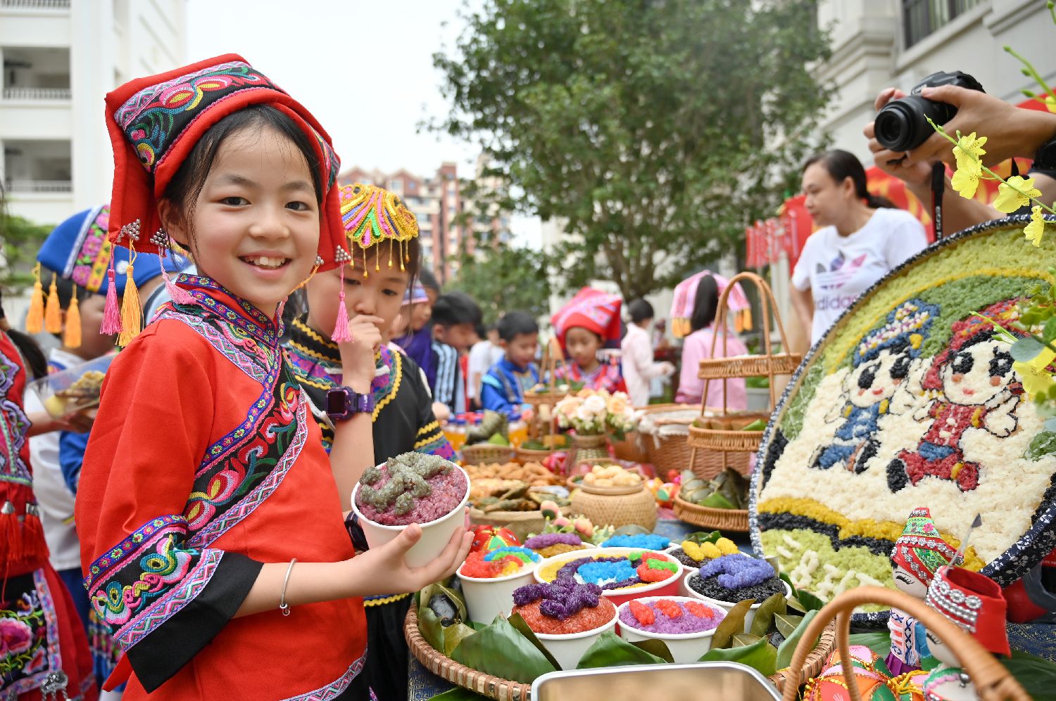 2024年4月20日,“壮族三月三”将至,广西南宁市桂雅路小学开展壮乡“三月三”美食汇等特色活动,学生们通过品尝壮乡特色美食,跳竹竿舞、对唱山歌等形式,感受壮乡文化,迎接“壮族三月三”的到来。图为一学生展示“五色糯米饭”。(图/中新社)