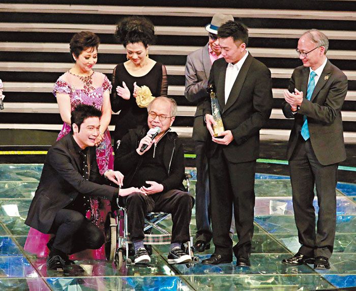 2015年,卢国沾在第37届十大中文金曲颁奖典礼上,再获颁香港乐坛最高荣誉奖项“金针奖”。图为徒弟罗嘉良跪下向卢国沾致敬。(图/香港《文汇报》)
