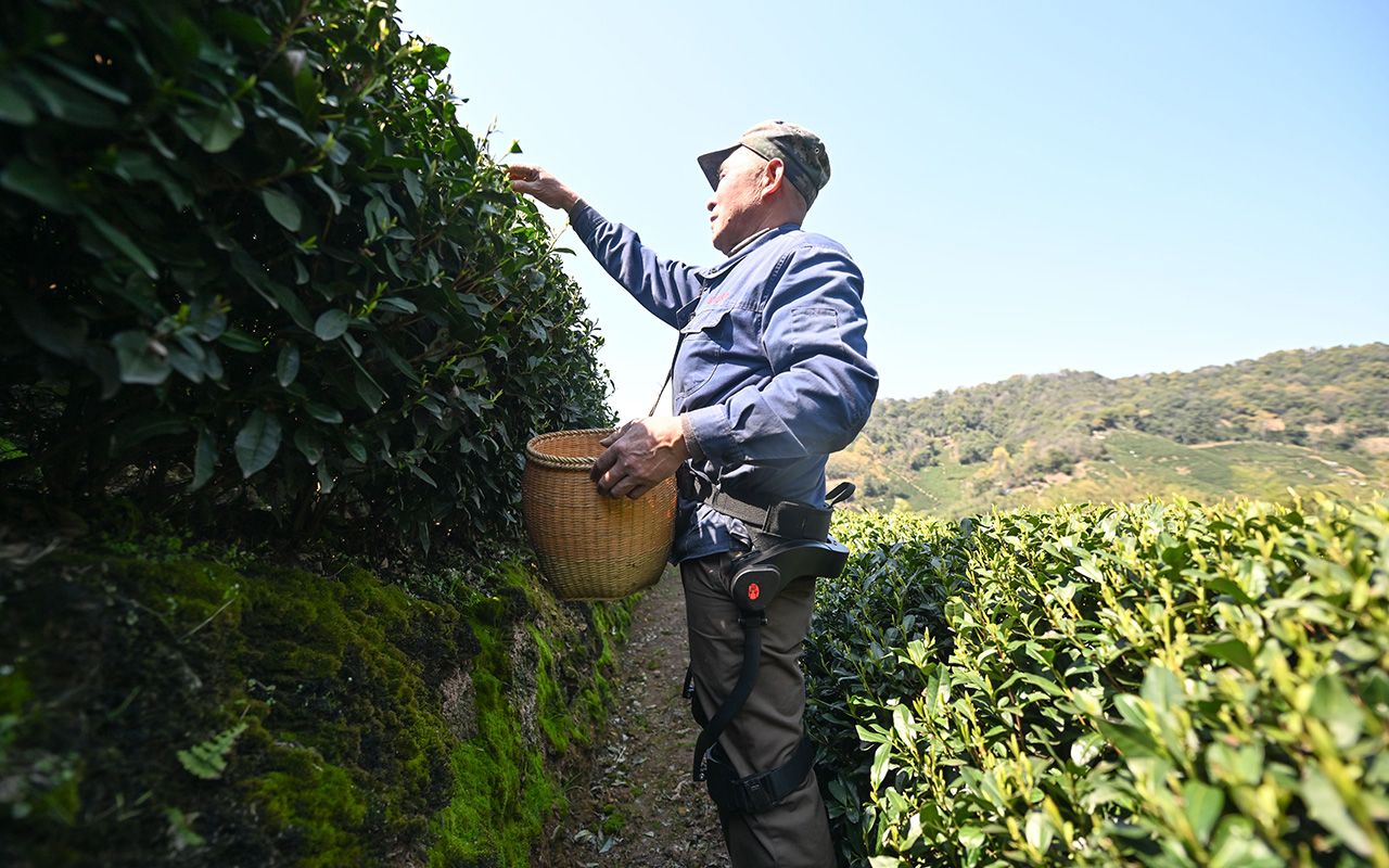 图为3月20日,浙江杭州,茶农穿着助行外骨骼在茶山上采摘西湖龙井茶。(中新社)