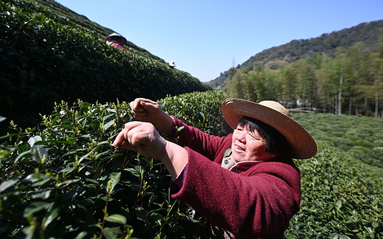 图为3月20日,浙江杭州,茶农在采摘茶叶。(央广网)