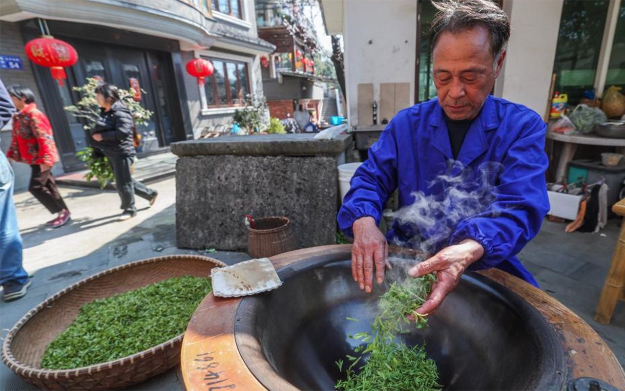 图为3月20日,浙江杭州,西湖龙井茶基地一级保护区杭州翁家山村的茶农翁永佩在手工炒制刚采摘的西湖龙井茶。(新华社)