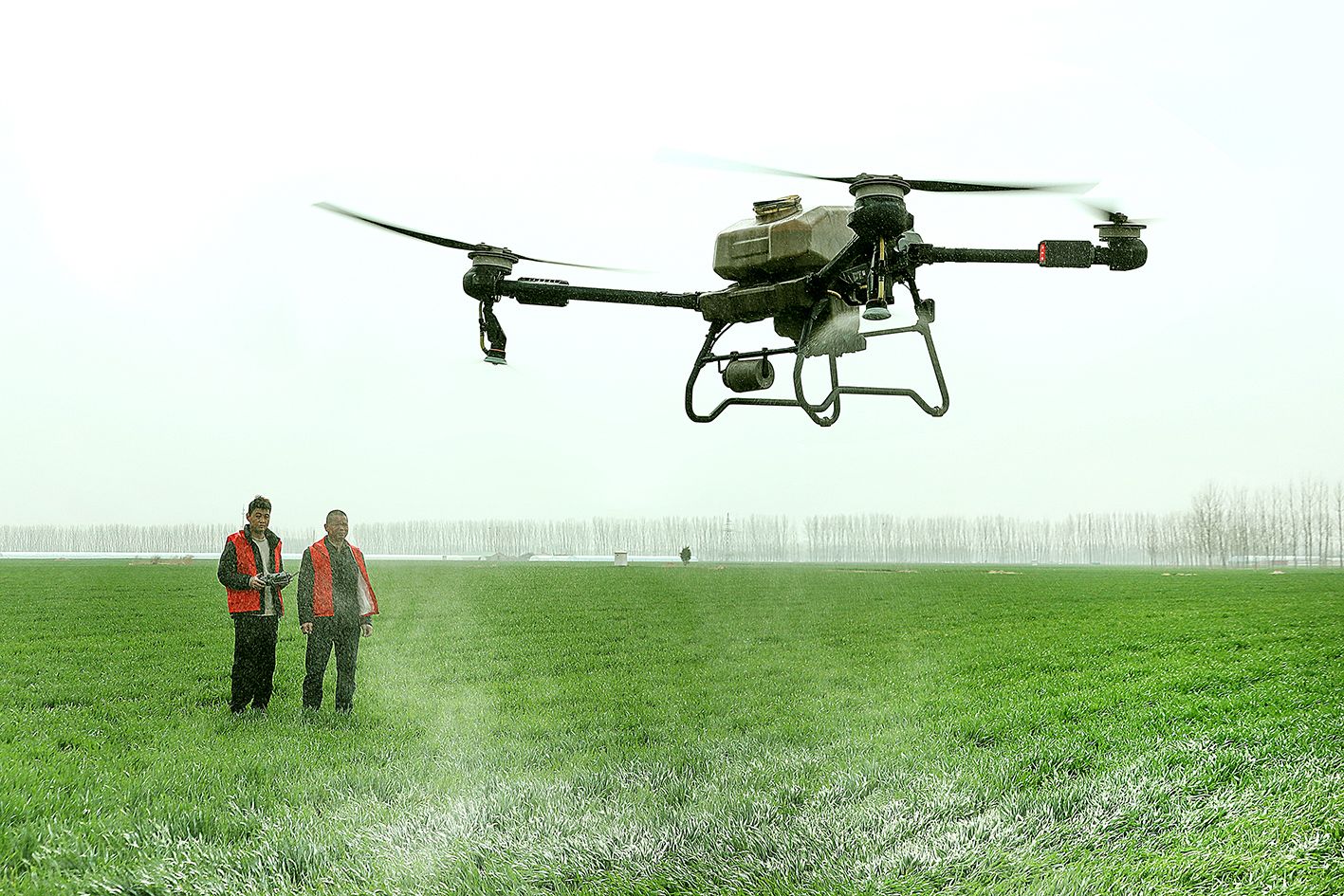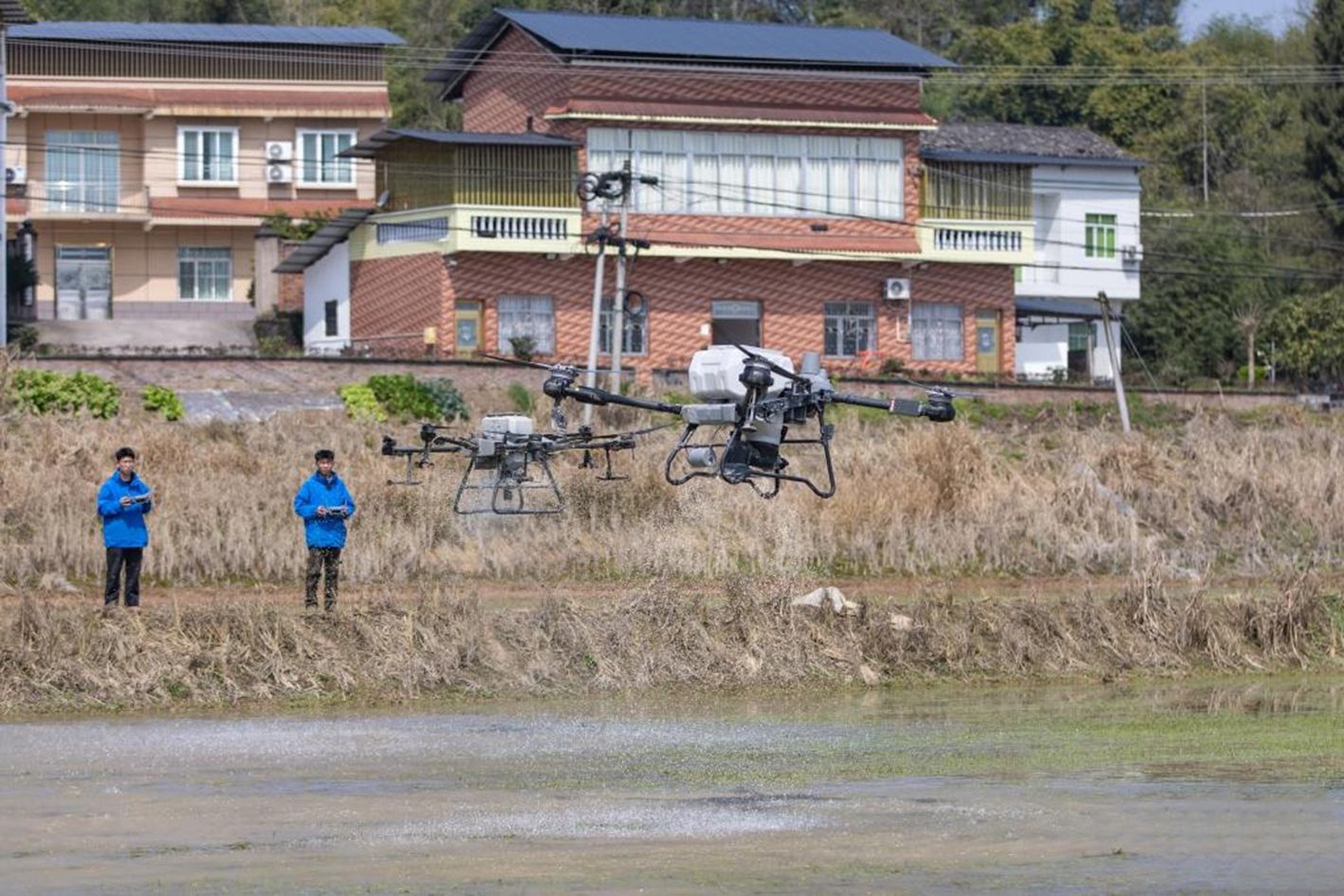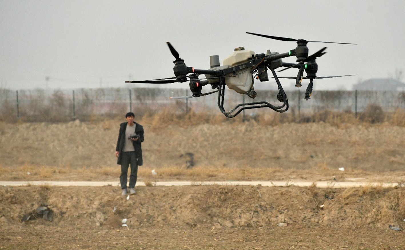 3月20日,在重庆市梁平区仁贤街道五一社区,重庆田中秧农业科技股份合作社的技术人员操作植保无人机在农田实施施肥作业。(新华社)