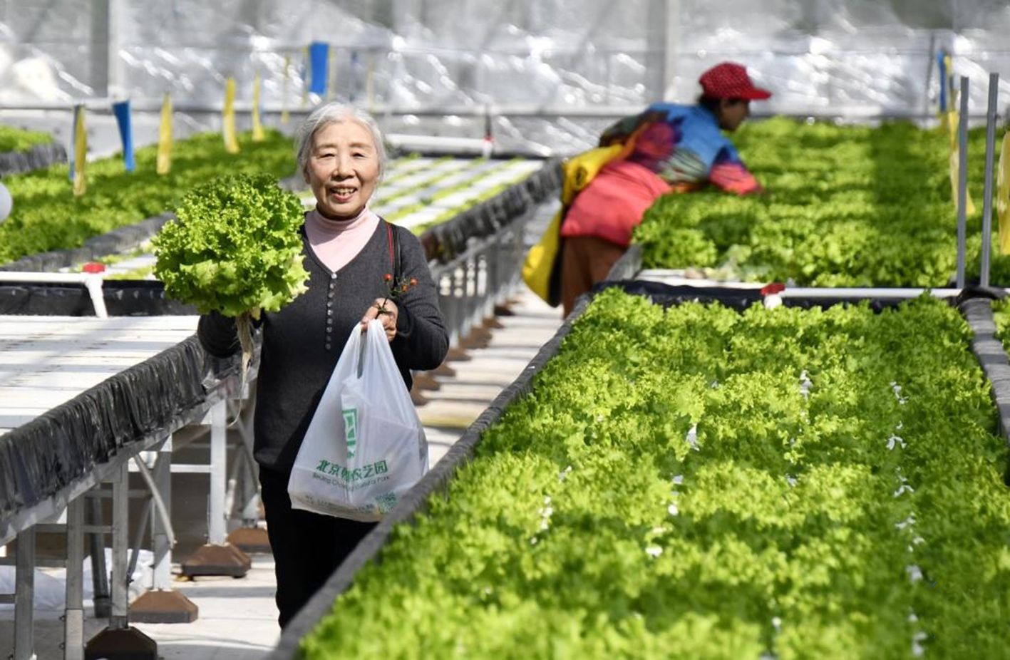 3月18日,市民在朝来农艺园温室内采摘新鲜蔬菜。初春时节,位于北京市朝阳区来广营的朝来农艺园内生机勃勃。机器人“农民”忙着喷药采摘、环境传感器24小时在线并实时上传作物数据……在新质生产力助力下,传统农业转变为更有生机和活力的数字农业。(新华社)