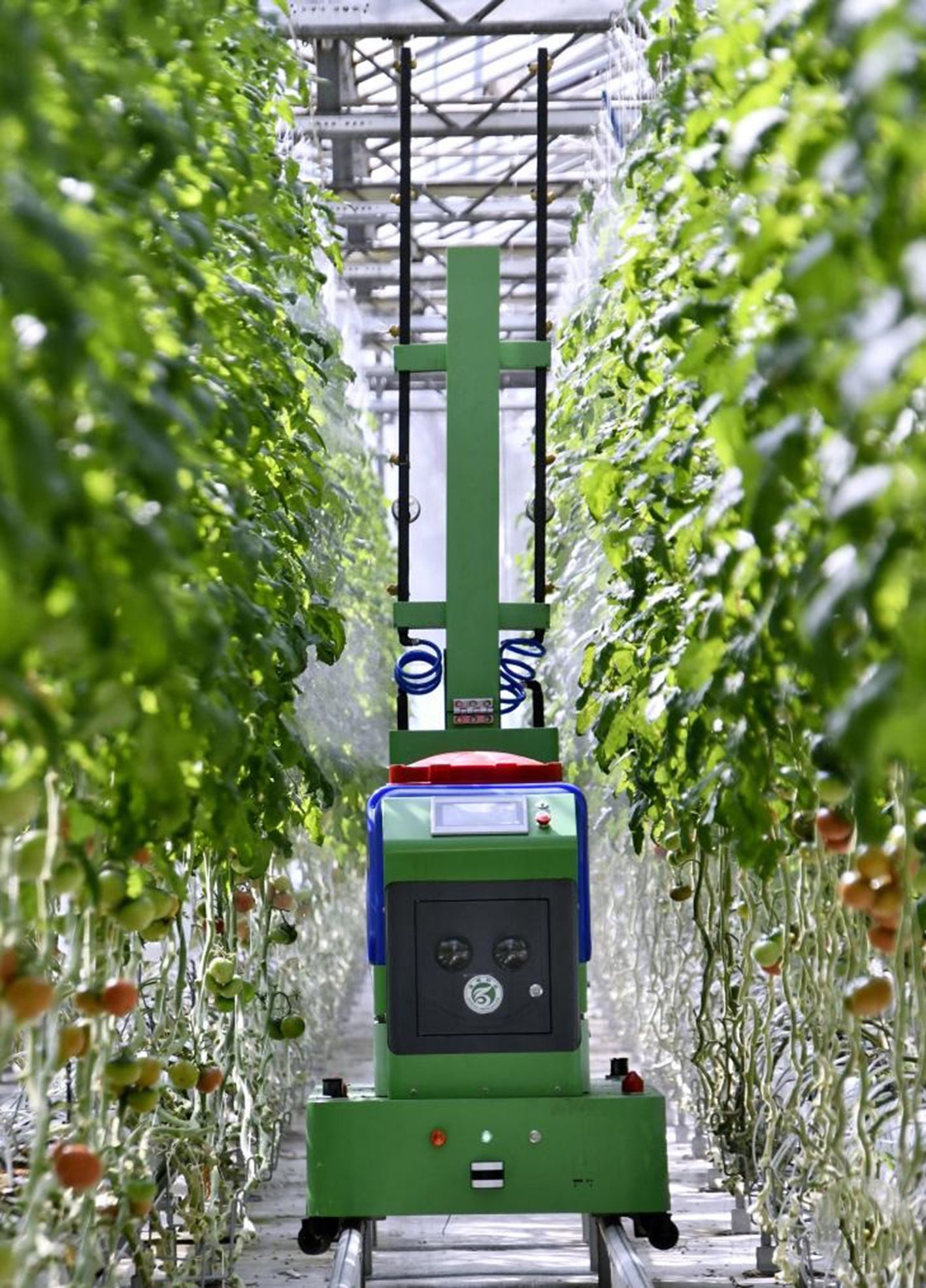 3月18日,朝来农艺园数字化温室内的智能水肥机器人在无土栽培的番茄片区内工作。该园区采用多类型温室全国产化数字设备集成系统和数字农业综合管理系统,集成采集器、控制器、环控设备、水肥设备等2000多套数字化设备,实现了温室内光、温、水、气、肥等作物生长要素实现智能环控,保障作物优产优质。(新华社)