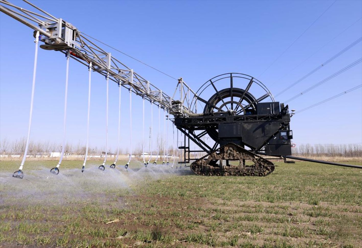 3月17日,一台自走式水肥一体农田喷灌设备在河北省唐山市丰南区东田庄镇的冬小麦田间进行喷灌作业。(新华社)