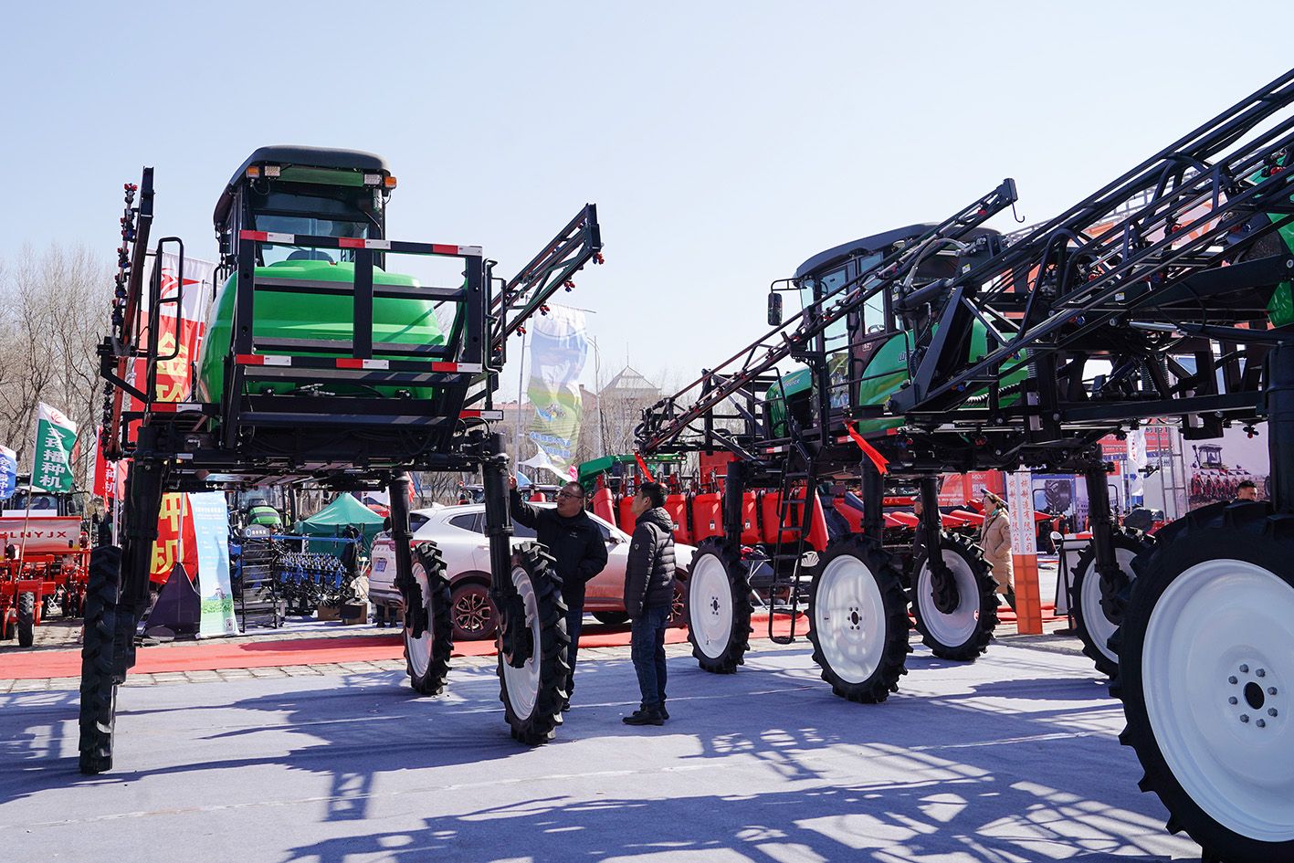 3月18日,黑龙江哈尔滨,观展者在2025黑龙江农机产品展示交易会上咨询自走式喷杆喷雾机。据悉,该展会设置室内国际标准展位200个,室外展场4万平方米,覆盖了农业生产耕、种、管、收等全过程的农机设备。恰逢备春耕时节,该展会吸引不少观展者选购农机。(中新社)