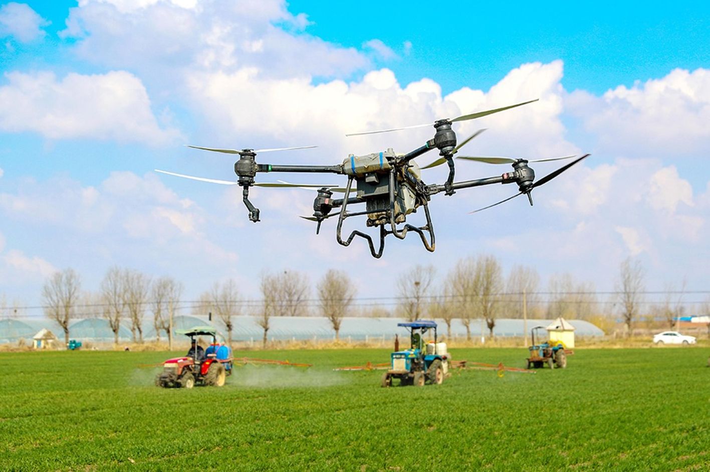 3月18日,河北省石家庄市藁城区北营村,农民驾驶农机、利用植保无人机进行小麦管护作业。时下,天气回暖,当地农民抢抓农时开展授粉、育苗、喷药等春季农业生产管护,田间地头一派忙碌景象。(中新社)