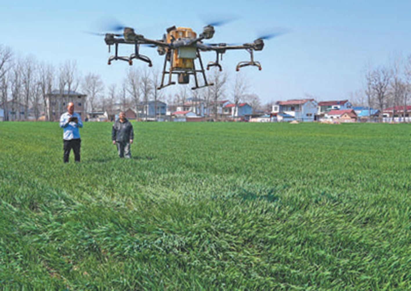 3月19日,河南省太康县,农技人员操控植保无人机给小麦施肥。(人民网)
