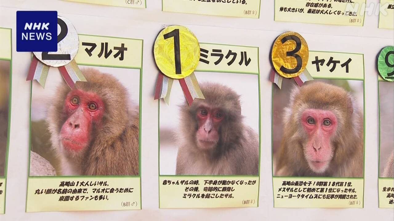 高崎山自然动物园每年都会举办名为“选拔总选举”的活动,让游客票选自己喜欢的猴子。今年共有16只猴子参加评选,投票时间为期一个月,截止至本月15日,最终结果于22日在特别设置的舞台上公布。获得第一名的是母猴“奇迹”,它出生后不久下半身就无法动弹,但后来却奇迹般康复。今年首次参选的它,以巨大优势领先第二名,夺得冠军宝座。排名第二的是“丸男”(Maruo),这只猴子虽然非常警觉,但却难得可以和游客一起合影,因此广受欢迎。在发表结果时,“奇迹”并未出现在喂食场地,由一名穿着猴子玩偶服装的工作人员代替它领取了第一名的奖状。现场观看结果发表的一位6岁男孩说:“奇迹很可爱,我一直支持它,它能拿第一名,我很开心。”