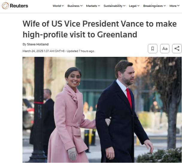 美国副总统万斯的夫人乌莎·万斯将于27日访问格陵兰岛。(图/路透社报道截图)