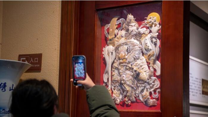2月3日,游客在广西北海贝雕博物馆拍摄贝雕作品《日月门神》。(图/中新网)