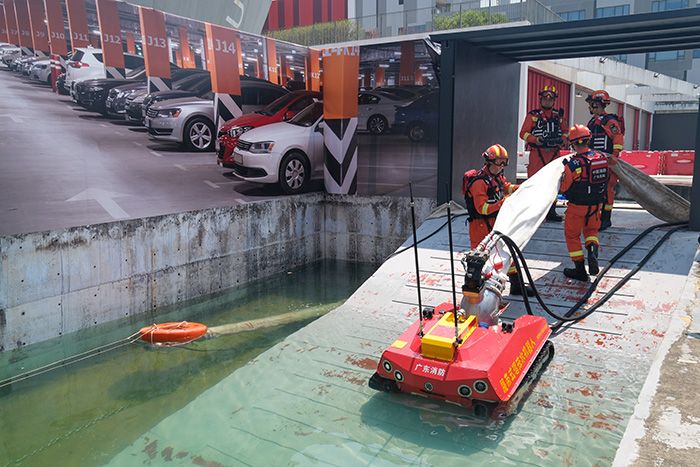在26日举行的风暴潮侵袭山谷路段模拟演练场景中,三地消防救援人员分工协作,借助高空拯救车、绳索、三脚架等工具,对“伤者”进行急救,并将其转移至安全区域。在地下车库水淹模拟场景里,广东省消防救援总队出动排水机器人抽积水,提升救援效率。