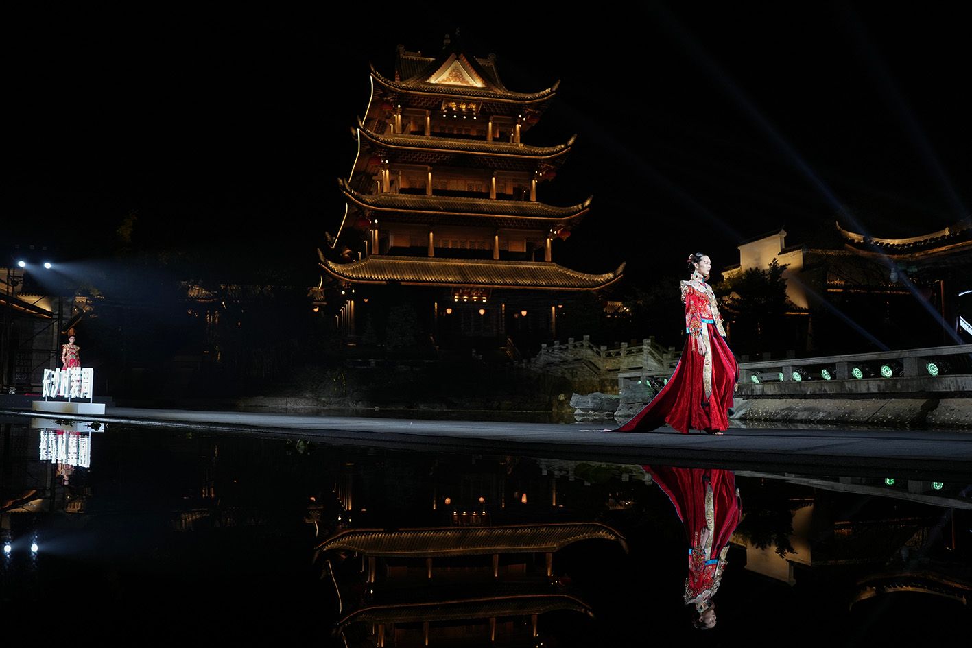 2025长沙时装周在长沙橘子洲江天暮雪文化园举行。本季大秀服装融合经典线条剪裁与可穿性设计,打造出兼具美学与实用价值的时尚语言。模特们身着各种时尚的服装走秀,与古建筑共同交织成一场精彩的视觉盛宴。图为模特在古楼下走秀。(中新社)