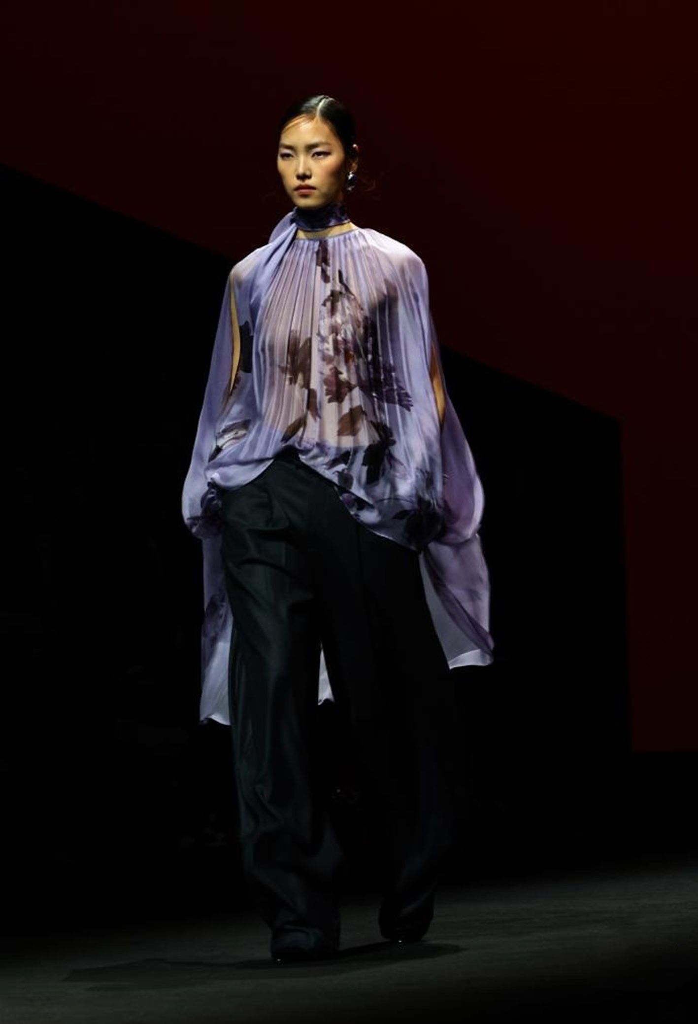 3月25日,在位于上海新天地太平湖畔的上海时装周红庭秀场,模特展示时装。当日,2025秋冬上海时装周开幕,开幕大秀以“雅莹·上海”为主题。(新华社)
