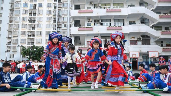 北京时间当天上午,伴随着孩子们唱起《壮族敬酒歌》,活动拉开了序幕,千名身着民族盛装的师生,围成层层叠叠的同心圆,踏着音乐的鼓点,跳起了民族舞蹈,师生们时而如石榴籽般紧密簇拥,时而舒展成象征团圆的铜鼓纹样。千人《竹竿舞》将活动推向高潮,千名师生跟随着竹竿有节奏的开合,大家默契配合,脚步轻盈地跳跃其间,共享节日带来的快乐。