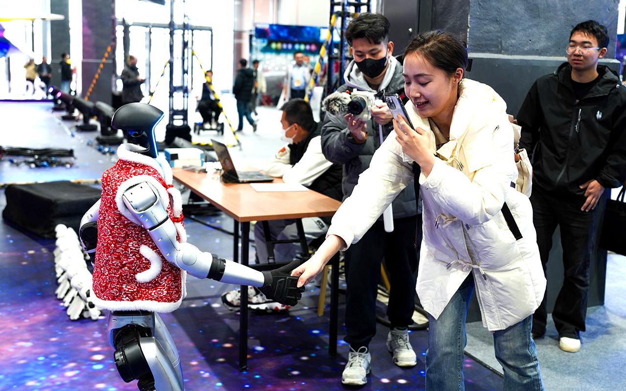 图为3月27日,北京石景山,媒体记者与人形机器人握手互动。(中新社)