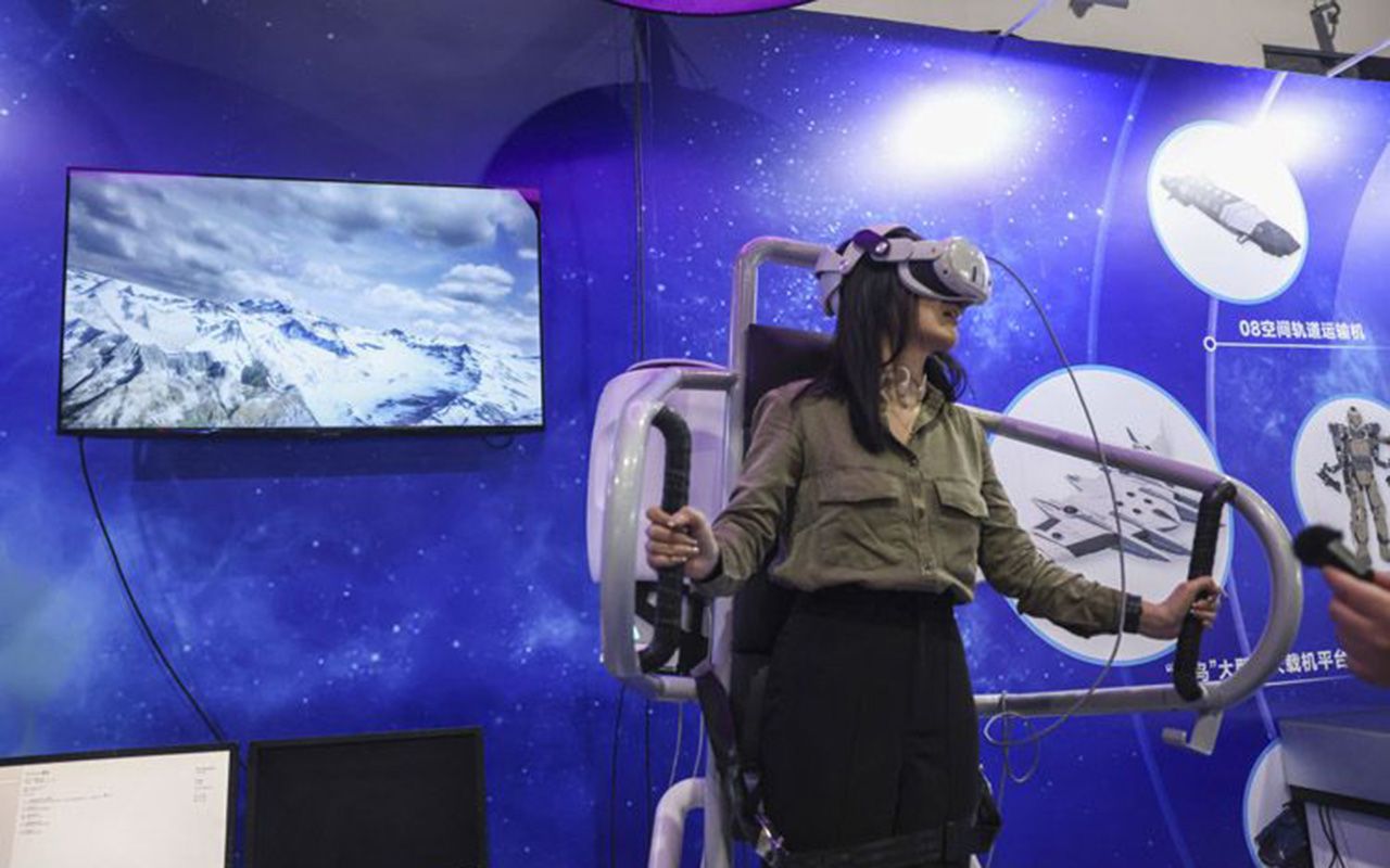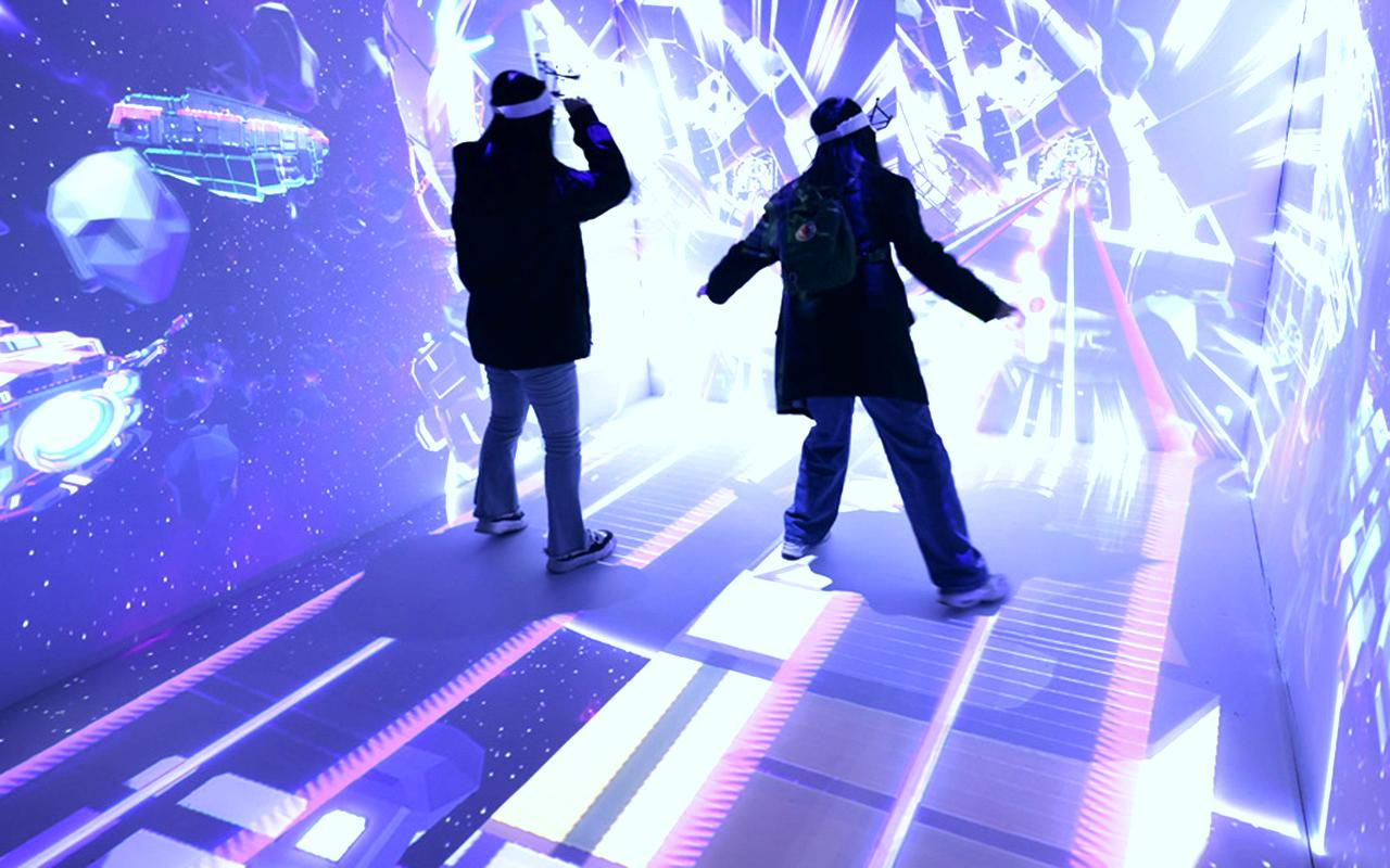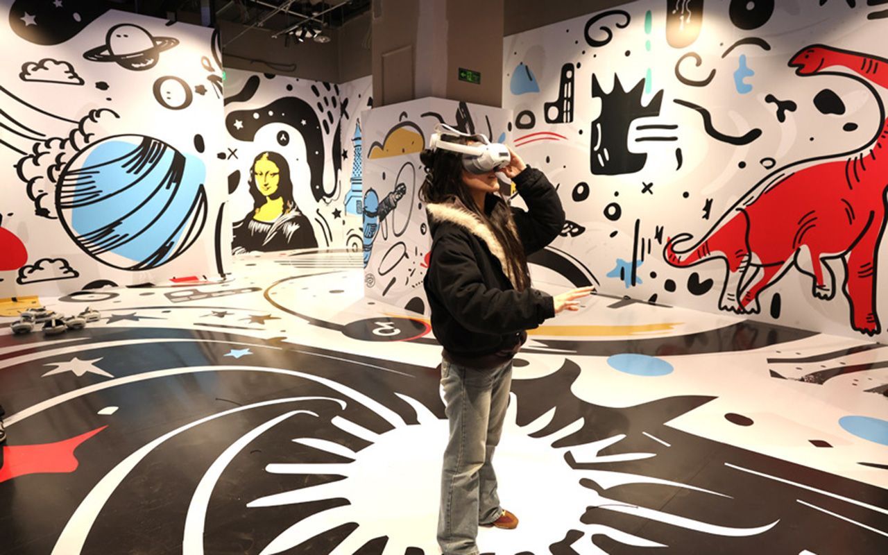 图为3月27日,北京石景山,媒体记者体验XR沉浸式互动体验空间。(中国日报网)