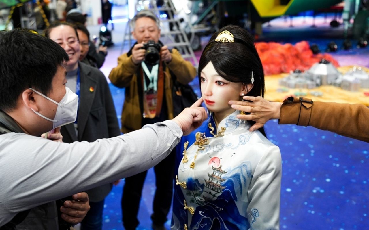 图为3月27日,北京石景山,仿真人形机器人吸引媒体记者。(中新社)